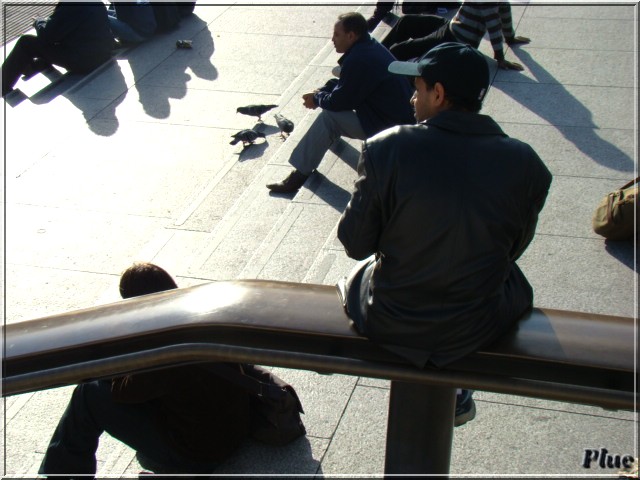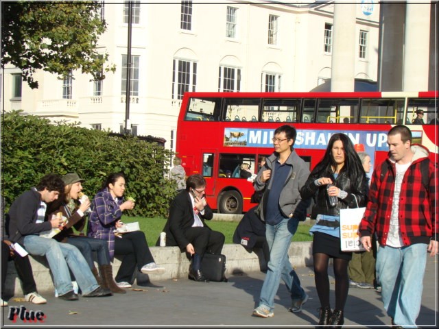 Faute de bancs, les gens s'assoient où ils peuvent : bords de bassins, marches, murets, parapets, pelouses et même sur les statues, comme ce touriste perché sur le dos d'un lion à Trafalgar Square à Londres. |