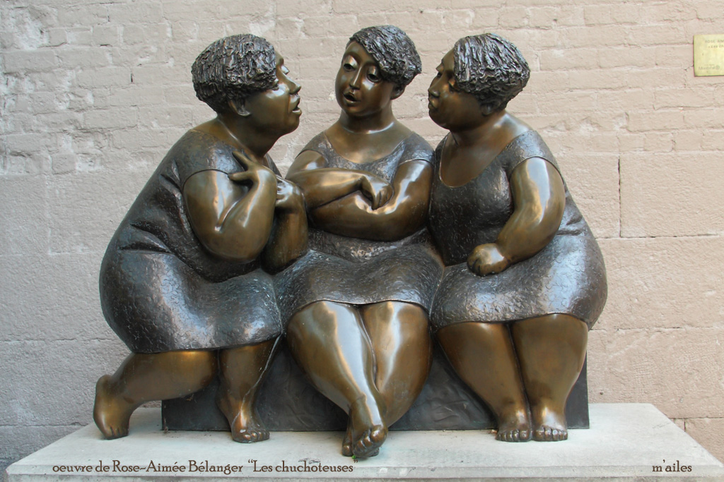 Des bancs avec des sculptures en bronze de l'artiste Rose-Aimée Bélanger |