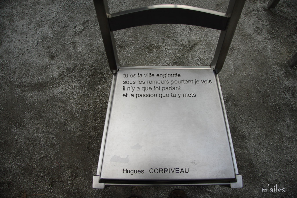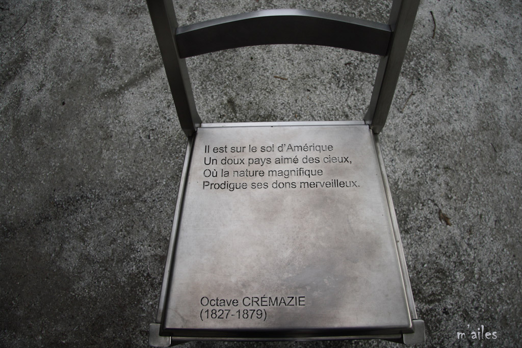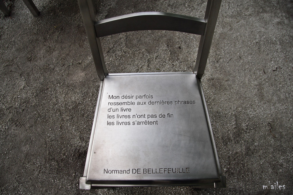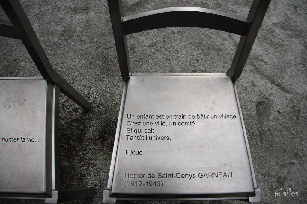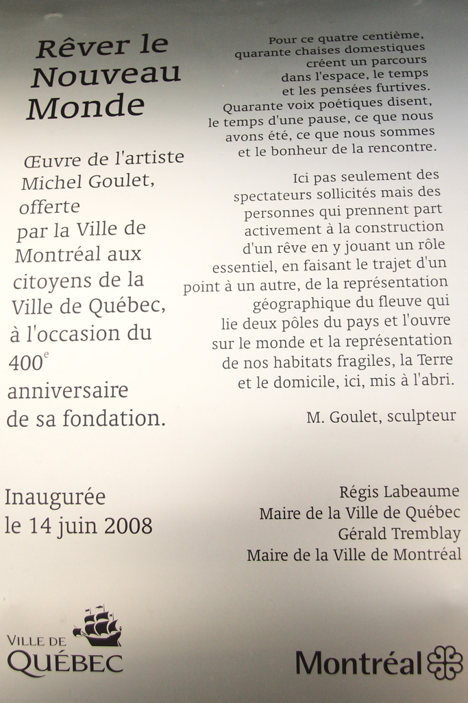 "Rêver le Nouveau Monde" http://www.michelgoulet.ca/fr/projets/rever.htm Œuvre d’art offerte par la Ville de Montréal à la ville de Québec pour son 400ème anniversaire . Ces chaises sont installées devant la Place de la Gare tout près du Vieux-Québec. 44 chaises-poèmes en acier inoxydable et bronze, œuvres du sculpteur québécois MICHEL GOULET http://www.michelgoulet.ca/fr/index.htm |