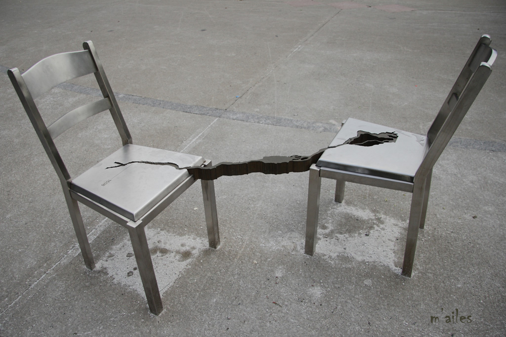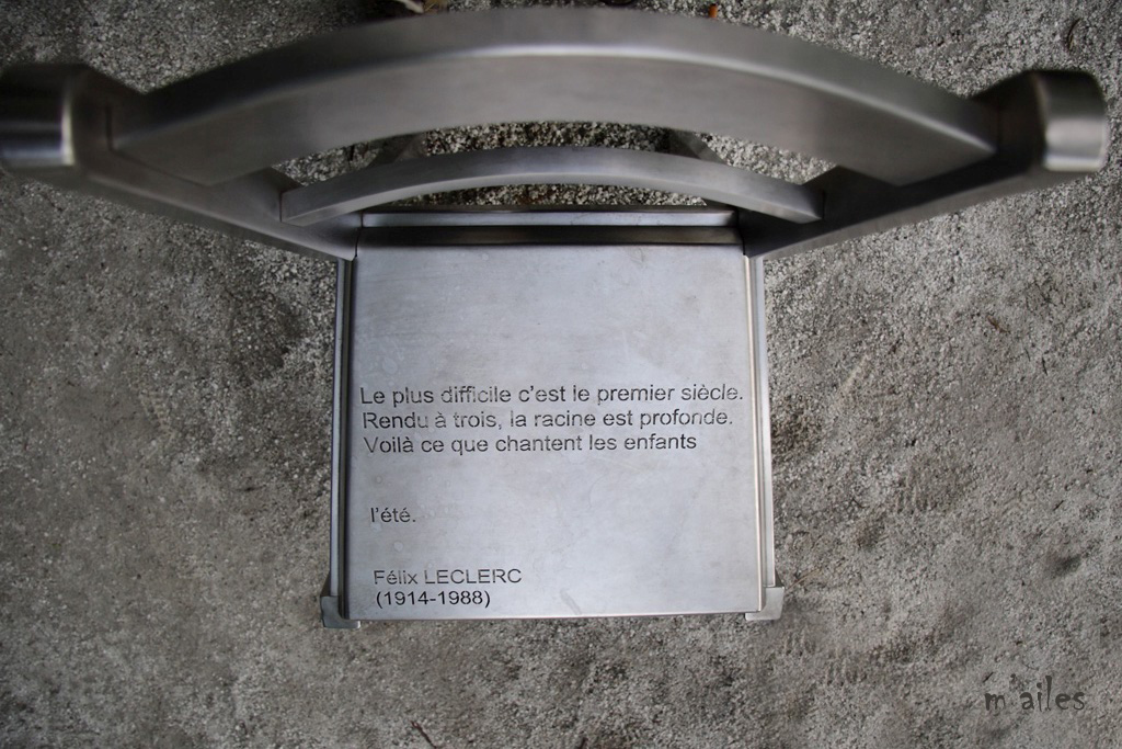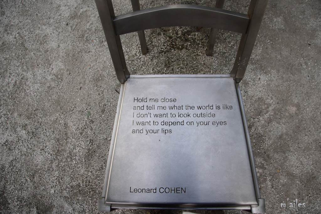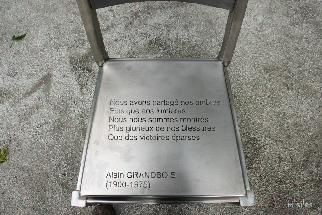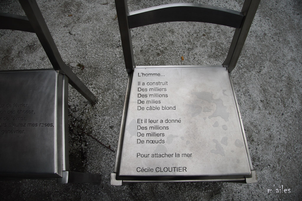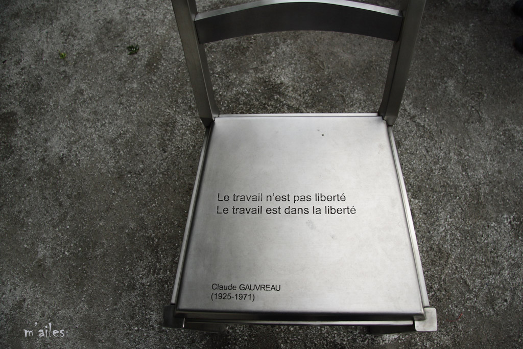 "Rêver le Nouveau Monde" http://www.michelgoulet.ca/fr/projets/rever.htm Œuvre d’art offerte par la Ville de Montréal à la ville de Québec pour son 400ème anniversaire . Ces chaises sont installées devant la Place de la Gare tout près du Vieux-Québec. 44 chaises-poèmes en acier inoxydable et bronze, œuvres du sculpteur québécois MICHEL GOULET http://www.michelgoulet.ca/fr/index.htm |